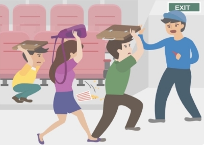 흔들림이 멈출 때까지 가방 등 소지품으로 몸을 보호하면서 자리에 있다가, 안내에 따라 침착하게 대피합니다.