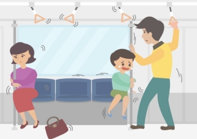 손잡이나 기둥을 잡아 넘어지지 않도록 합니다. 전철이 멈추면 안내에 따라 행동합니다.