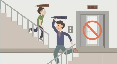 건물 밖으로 나갈 때에는 계단을 이용하여 신속하게 이동합니다. (엘리베이터 사용 금지)