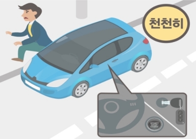 비상등을 켜고 서서히 속도를 줄여 도로 오른쪽에 차를 세우고, 라디오의 정보를 잘 들으면서 키를 꽂아 두고 대피합니다.