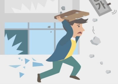건물 밖에서는 가방이나 손으로 머리를 보호하며, 건물과 거리를 두고 주위를 살피며 대피합니다.
