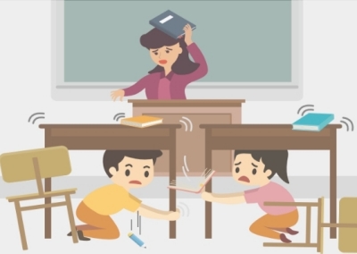 책상 아래로 들어가 책상다리를 꼭 잡습니다. 흔들림이 멈추면 질서를 지키며 운동장으로 대피합니다.