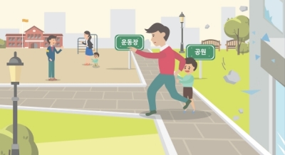 떨어지는 물건에 유의하며 신속하게 운동장이나 공원 등 넓은 공간으로 대피합니다. (차량 이용 금지)