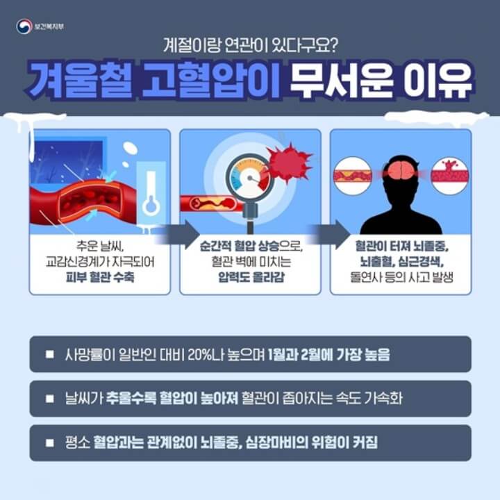 겨울철 추위는 신체 적응력을 떨어뜨려 사람을 질환에 취약한 상태로 만들게 됩니다. 고혈압 환자들에게도 겨울철은 사망률이 가장 높아지는 계절이므로 주의사항과 증상 등에 대해 알아보겠습니다.