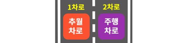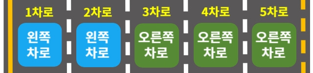 | 오른쪽 차로 | 대형승합자동차, 화물자동차, 특수자동차, 법 제2조제18호나목에 따른 건설기계, 이륜자동차, 원동기장치자전거(개인형 이동장치는 제외한다) | ||