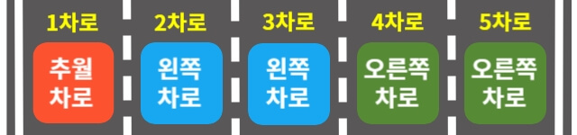 편도 5차선 고속도로에서는 1차로는 추월차로, 2,3차로는 왼쪽차로(승용차, 승합차 운행), 4,5차로는 오른쪽차로로 모든 차량이 운행할 수 있습니다. 4차로에서 주행하던 화물차 등은 3차로를 이용하여 추월할 수 있습니다.