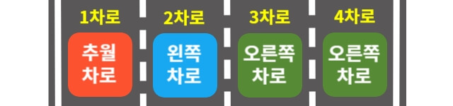 | 오른쪽 차로 | 모든 차량이 통행할 수 있음 오른쪽 차로로만 운행할 수 있는 자동차의 추월차로는 오른쪽 차로 바로 좌측에 있는 왼쪽 차로임. |