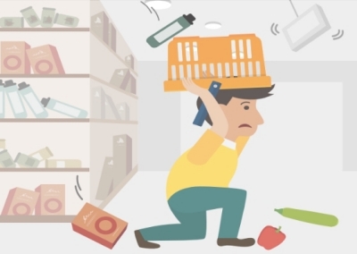 진열장에서 떨어지는 물건으로부터 몸을 보호하고, 계단이나 기둥 근처로 가 있습니다. 흔들림이 멈추면 밖으로 대피합니다.