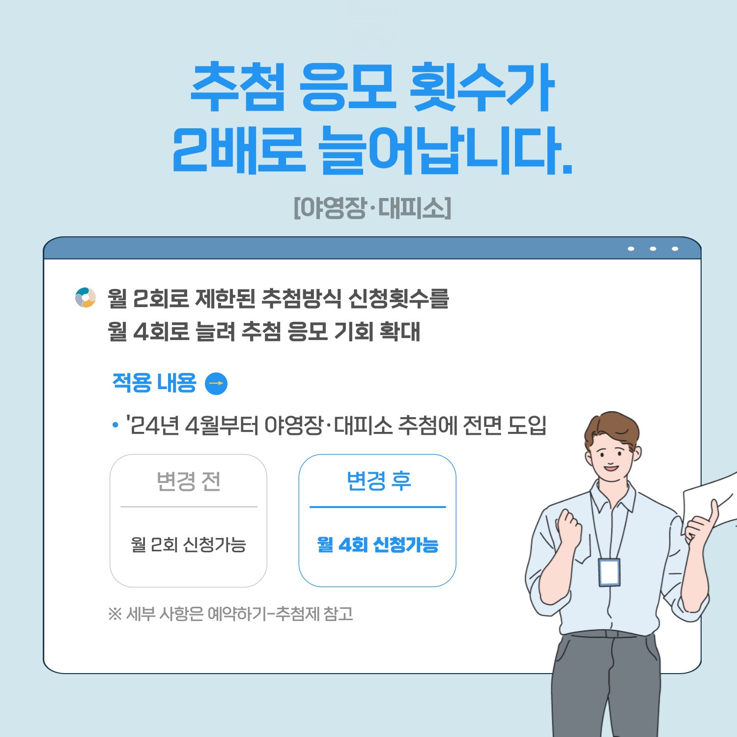 야영장 추점에 응모할 수 있는 기회는 월 4회까지 신청할 수 있습니다. 동일 날짜에 타 야영장을 중복으로 신청이 가능합니다. 하지만 당첨은 1건만 가능합니다.