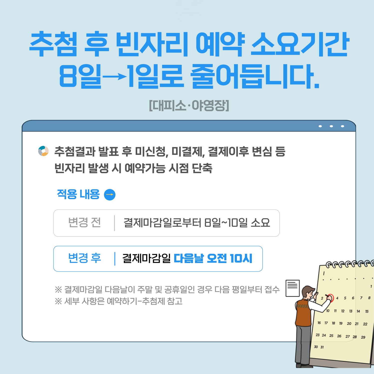 결제마감일 다음날이 주말이나 공휴일인 경우 다음 평일부터 접수합니다. (예 : 24년 4월 5일 예약 추첨 결과 발표, 당첨자 결제마감일인 6일의 다음날인 7일이 일요일인 관계로 빈자리 선착순 신청은 4월 8일 월요일 오전 10시부터 접수합니다.