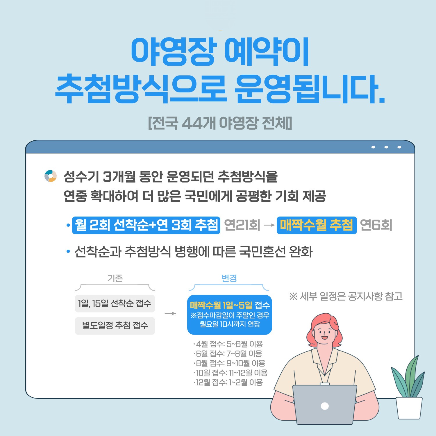 이용일 기준 24년 5월부터는 기존 선착순 예약이 폐지되고 모두 추첨식으로 진행됩니다. 추첨접수는 국립공원공단 예약시스템에서만 할 수 있습니다.
