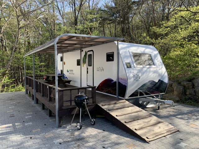 카라반을 빌려 사용하는 형태입니다. 야영장 별로 2인, 4인, 6인 등 다양한 크기의 카라반이 있습니다.,