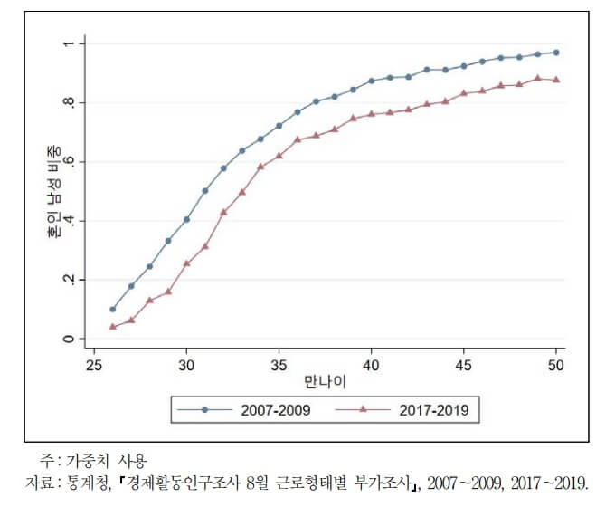 임금 수준을 10개의 구간으로 분할하여 조사한 결과 몇 가지 두드러진 통계를 보면 26~30세 구간의 남성들은 2007~2009년에 비해 2017~2019년 통계에서 전 임금구간에 걸쳐 매우 낮은 혼인율을 보이는 특징이 있으며, 46~50세의 경우 2007~2009년에 비해 2018~2019년 통계에서는 저임금 구간 남성들의 혼인율이 많이 감소한 것으로 나타났습니다.