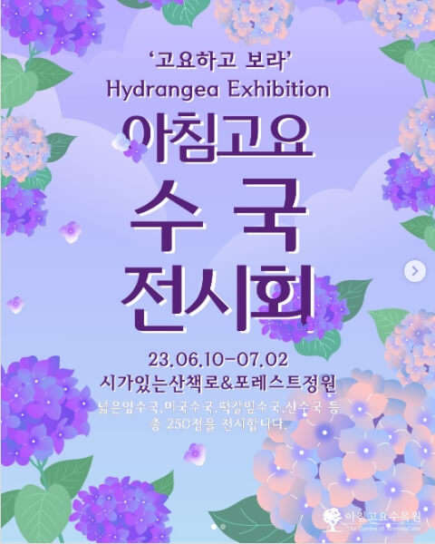 경기도 가평 아침고요수목원에서는 6월 수국이 활짝 피는 기간 동안 '고요하고 보라'라는 주제로 수국전시회가 열립니다. 산수국, 넓은잎수국, 떡갈잎수국, 미국수둑 등 각종 수국을 한자리에서 만날 수 있는 수국전시회에서 예쁜 사진도 찍고 소중한 추억을 만들어 보세요.