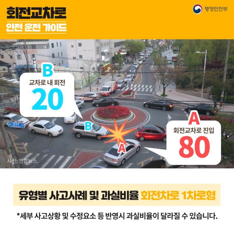 특히 회전교차로에 진입하던 차량이 회전 중인 차량의 후측방을 추돌한 경우, 진입차량에게 100%의 과실이 인정될 수 있으니 회전교차로 진입 시에는 이미 진입하여 회전 중인 차량에게 통행을 양보해야 합니다.