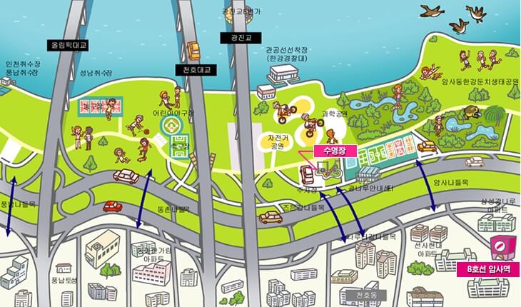 광나루 수영장은 천호대교 남단 광나루한강공원에 위치하고 있습니다.